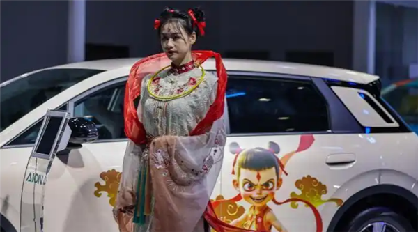 其中,一位美女车模装扮成“哪吒”造型为一车商站台,这一幕自然也吸引了不少人观看拍照。