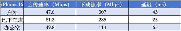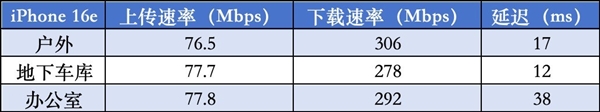 户外场景下,两款手机的信号水平都处在一个不错的水平上。相比之下,iPhone 16e在延迟表现上要优于iPhone 16。地下车库中,两款产品依旧保持了不错的上传/下载表现,但两者的延迟表现进一步劣化。而在室内环境中,两款手机的上传/下载表现都出现了明显的下滑。