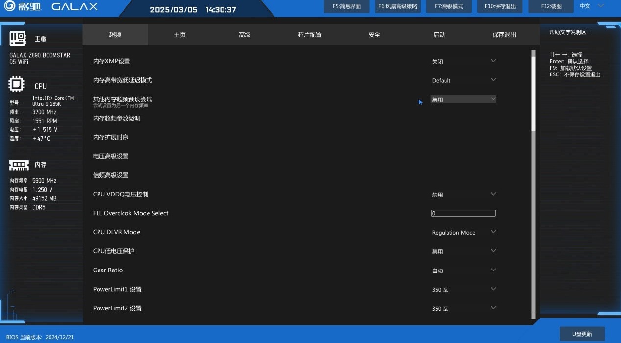 按F7进入高级模式,可以对主板进行深入调节,首先来到超频界面,内存、CPU超频都整合在这个界面中,在这里我们看到了一些熟悉的功能,比如AC/DC调节、XMP、时序、电压、频率等设置。影驰在BIOS中还支持内存高带宽低延迟模式调整。