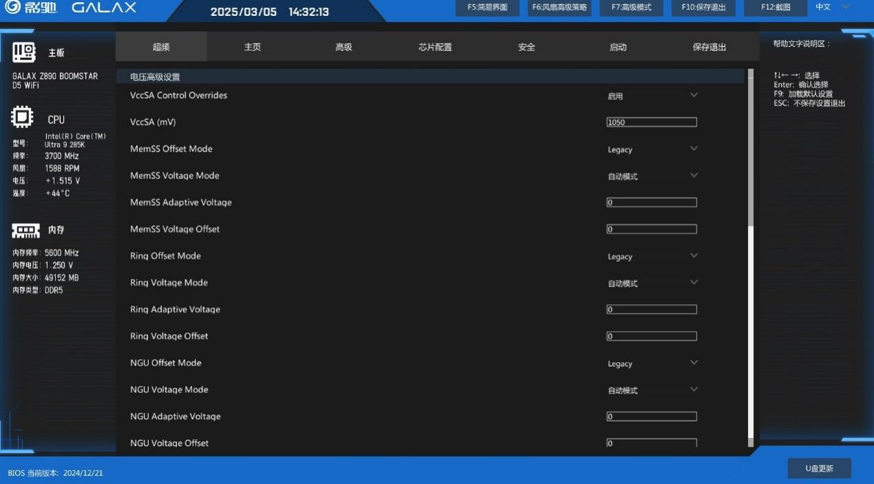 电压设置界面也比较全面,包含核心SA、NGU等相关电压选项设置以及模式调整。