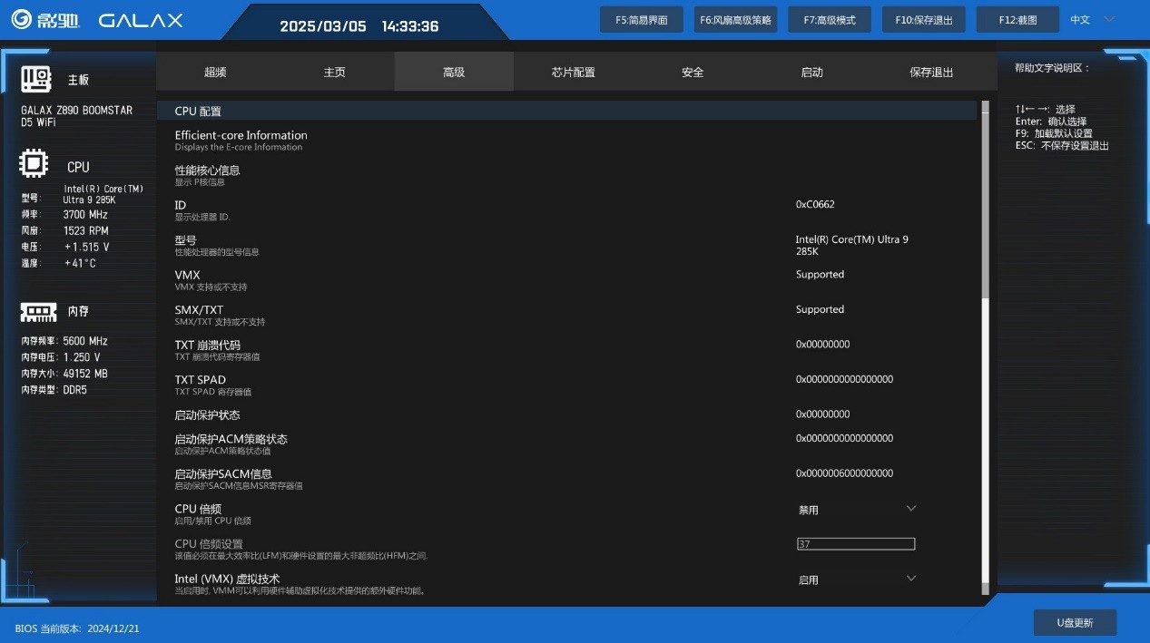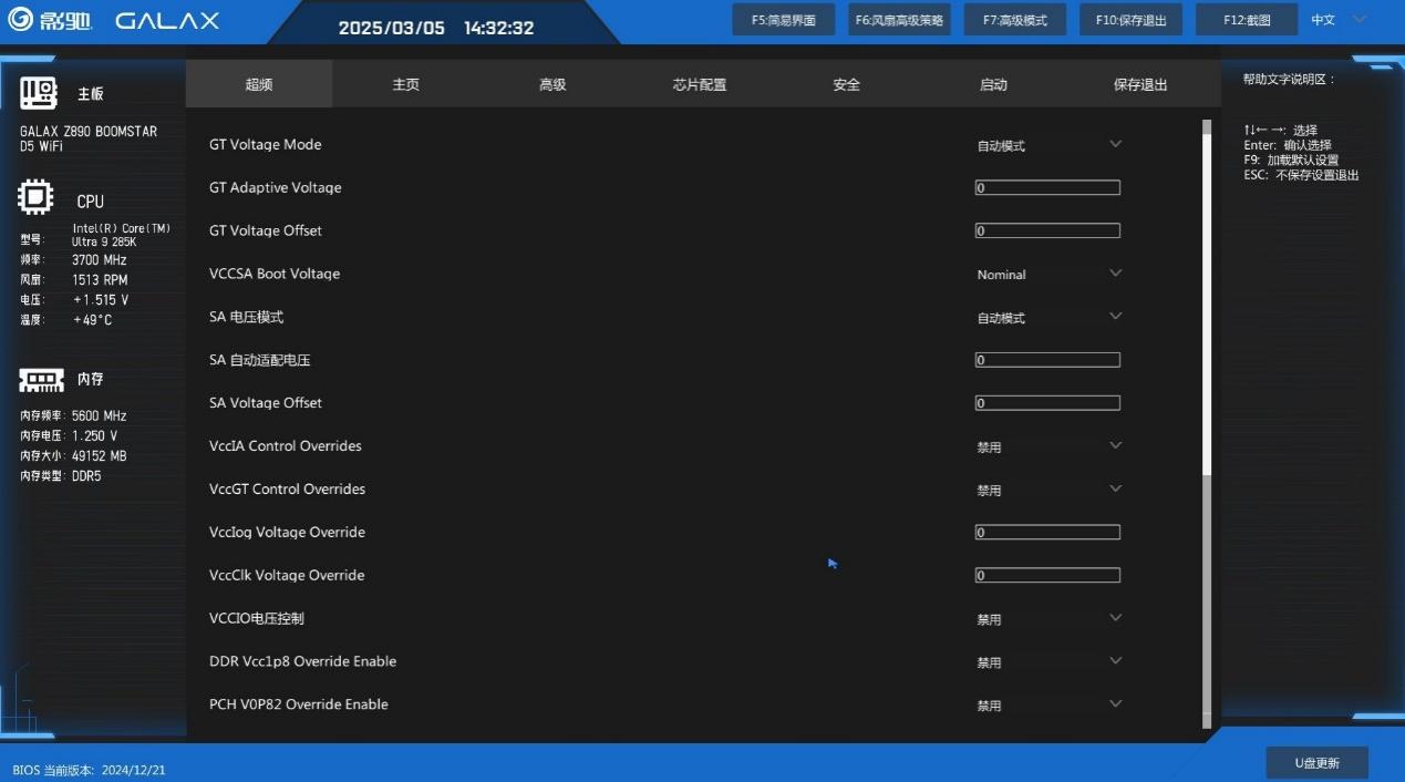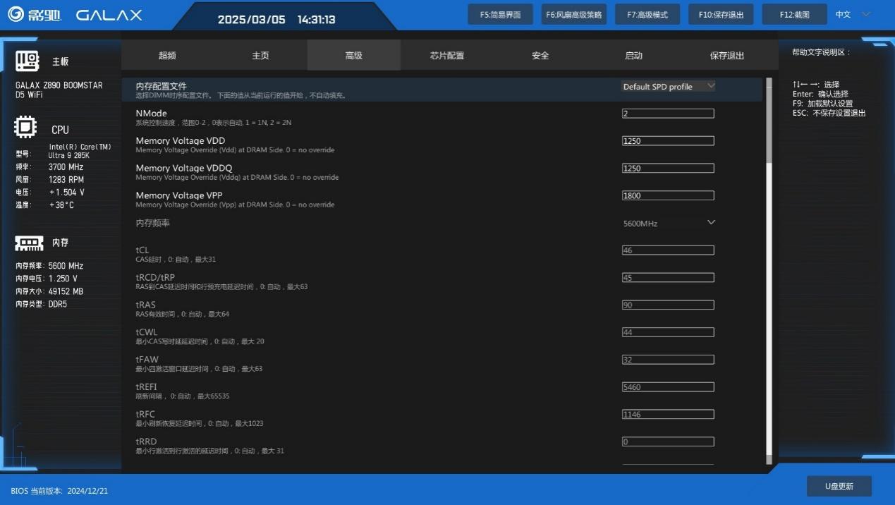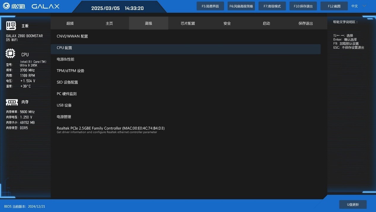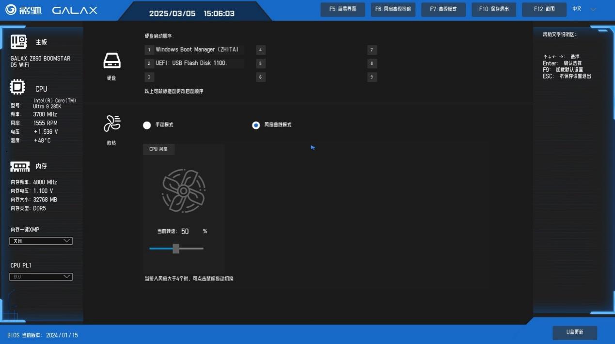 下面来看一下影驰星曜Z890星辉WIFI主板的全新BIOS,进入后首先来到简易主菜单界面,集成了主板简要信息和重要功能快速设置项,比如XMP和功耗墙以及风扇转速都能在这里调节,不过明显能看出来主菜单还有很大优化空间,期待影驰后续的更新。