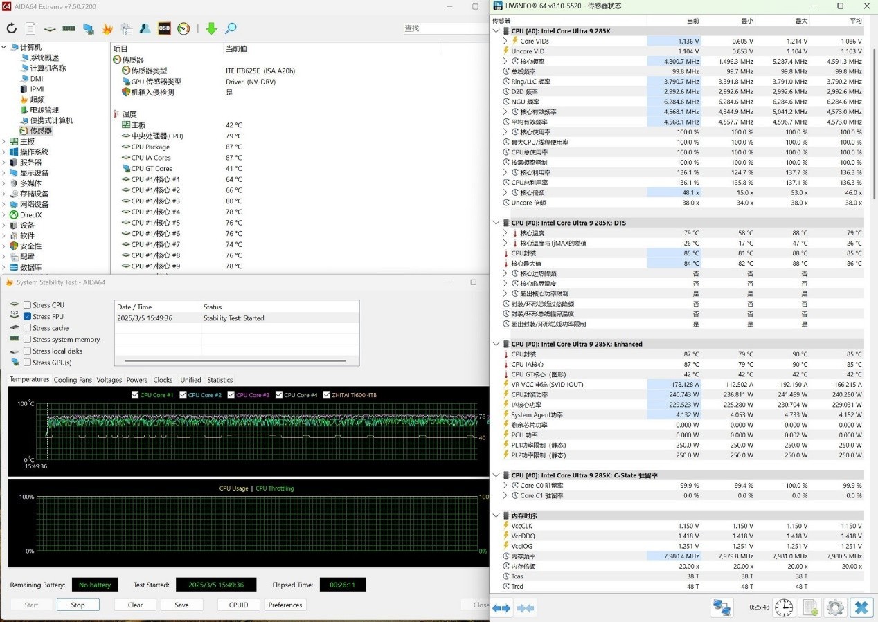 拷机接近了30分钟,酷睿Ultra 9 285K平均温度85℃,使用的默认模式,此时功耗为240W,对于影驰星曜Z890星辉WIFI主板没有什么压力。我们也尝试解锁功耗墙,测试后发现在275W功耗时,酷睿Ultra 9 285K温度就会到90℃以上,但对于性能提升有限,加上考虑到这两代酷睿平台的波动,建议默认即可。
