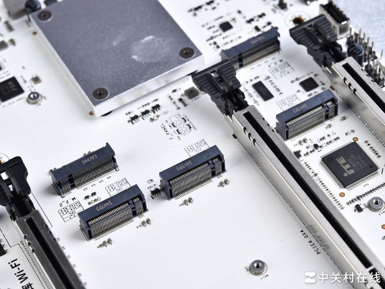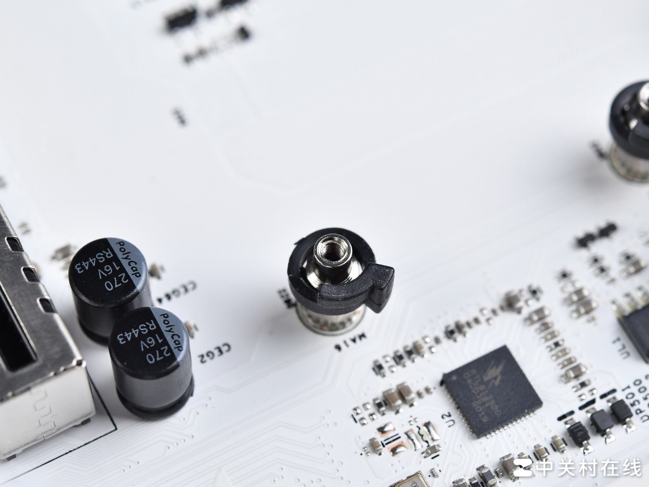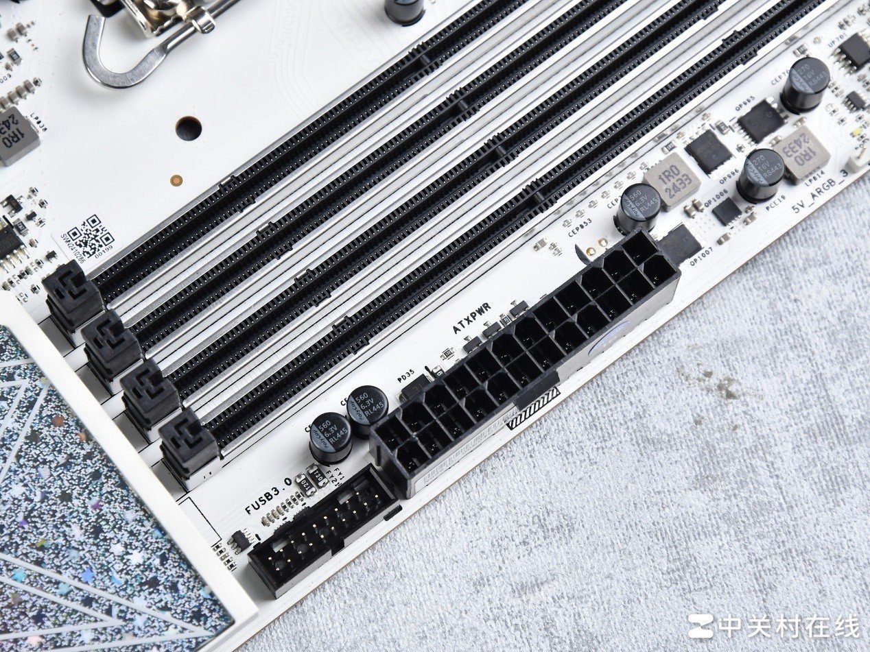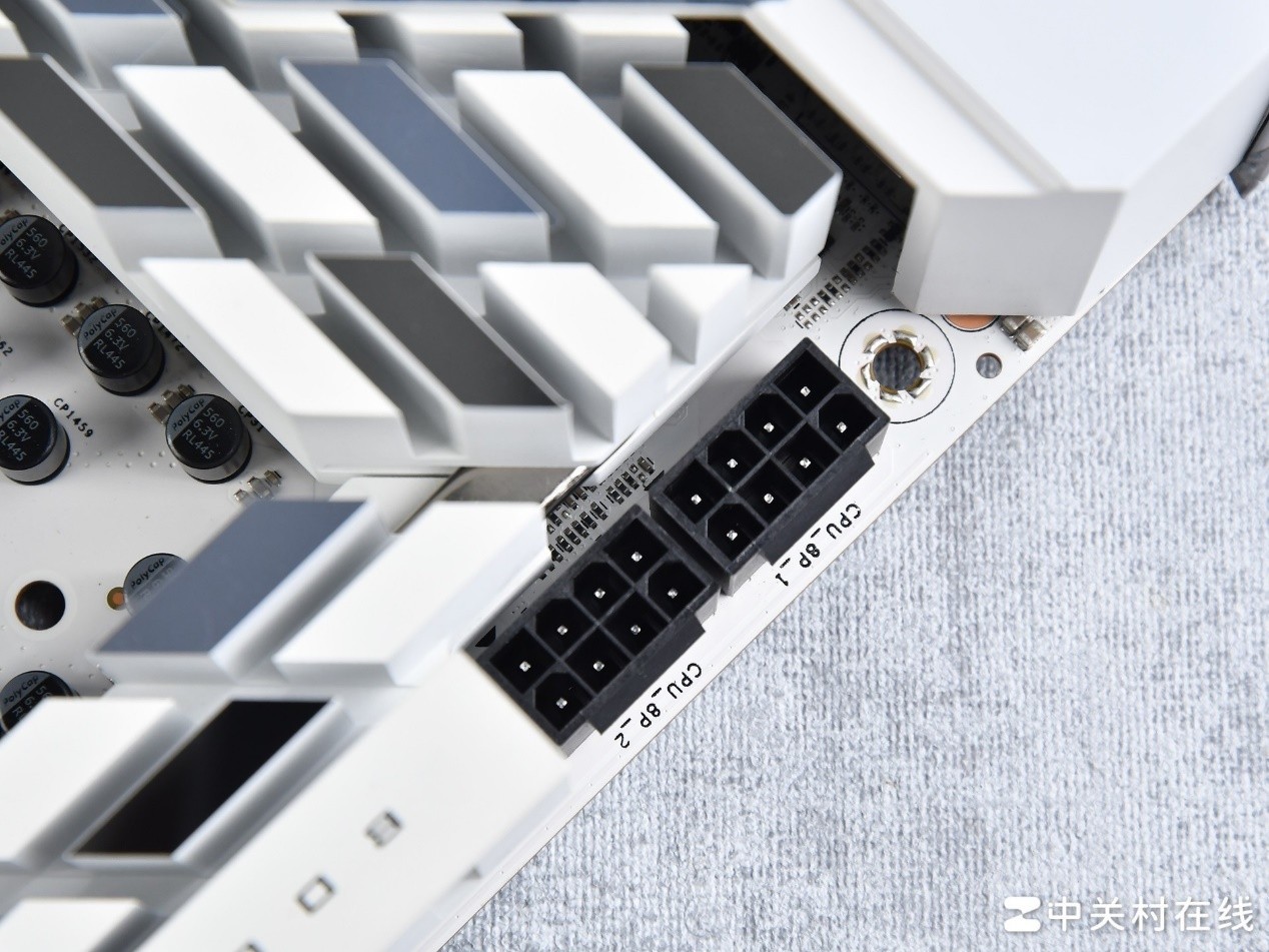 这款主板的CPU供电接口则为双8pin设计,相较于单8pin不仅能提供更高的功耗输出,还能缓解8pin供电线可能的发热问题。