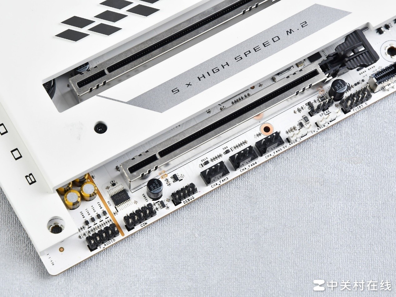 将影驰星曜Z890星辉WIFI主板PCIe插槽周围的装甲拆开可以看到M.2插槽,注意装甲的螺丝有一个隐藏在在芯片组星辉装甲下,拆卸需要注意,此外可以看到相较于常规主板,为了保证PCIe 1槽和PCIe 2槽有足够大的间距,这款主板的M.2 1槽位置下沉了,并未在PCIe 1插槽上方提供M.2插槽,因此不管安装几个SSD,都需要将整个散热装甲拆除。