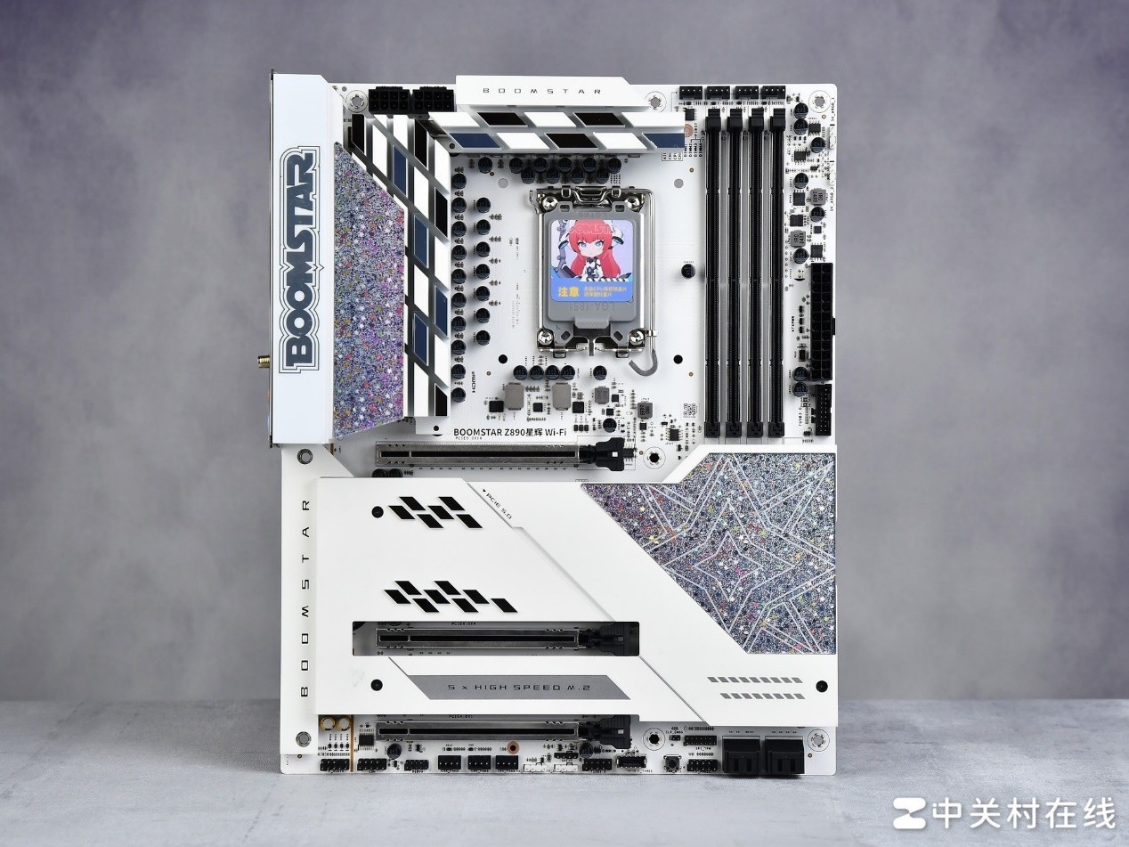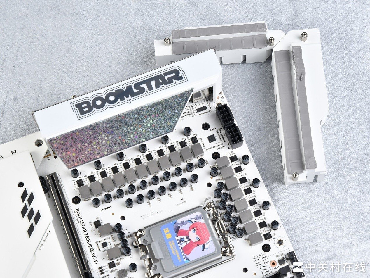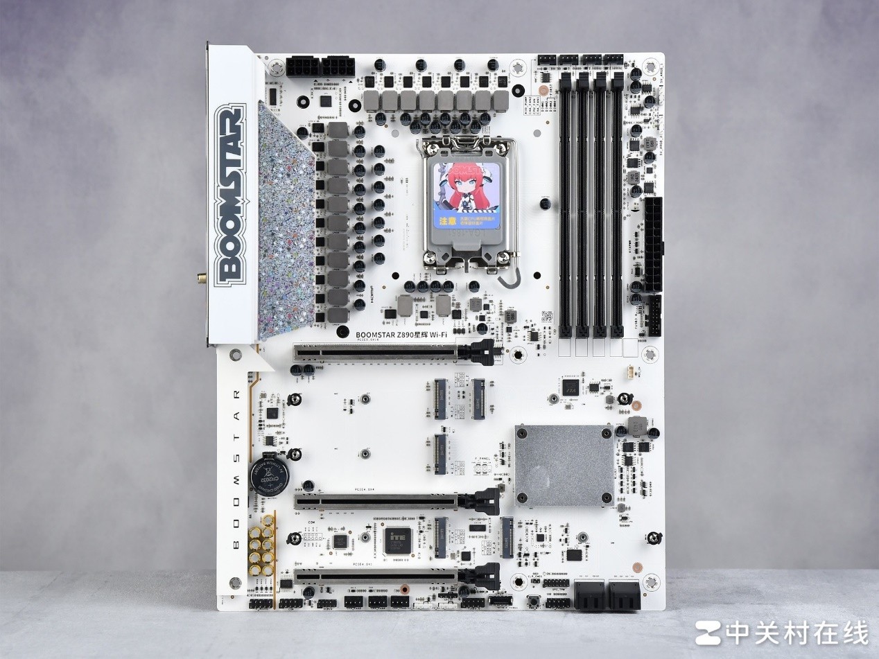 影驰星曜Z890星辉WIFI主板采用了ATX板型设计,是一款标准的大板。这款主板的颜值让人眼前一亮,整体以白色为主,增加了星光元素,尤其是BOOMSTAR标识的VRM散热装甲和芯片组的装甲看起来星光熠熠,与星曜系列相呼应。