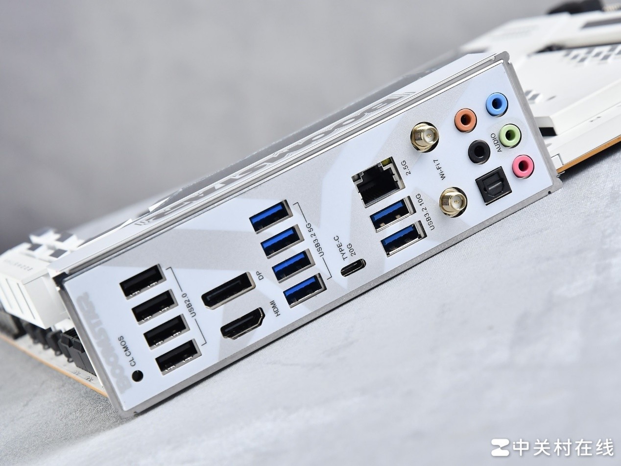 除了USB接口数量丰富外,这款主板在I/O区域还提供一个人HDMI接口,一个DP接口,一个2.5G有线网口,一个Wi-Fi7无线网卡的天线接口以及五个音频接口。