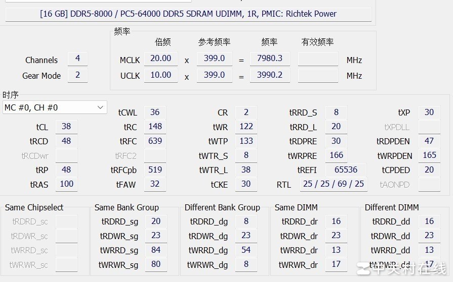 我们接下来测试一下XMP 8000MT/s时的性能表现,使用AIDA64进行跑分测试。