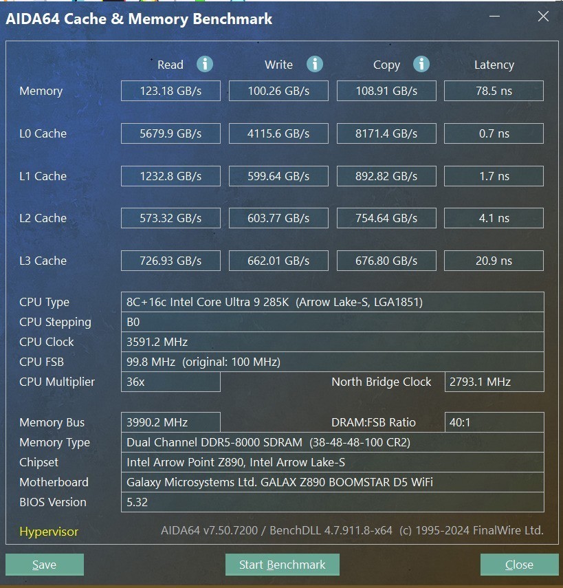在XMP 8000MT/s时,这套内存在影驰星曜Z890星辉WIFI主板上AIDA64读取达到107.19GB/s,写入达到91300MB/s,复制达到94385MB/s,延迟为89.1ns。下面我们来看一下开启影驰BIOS中高带宽低延迟模式后内存的读写变化。