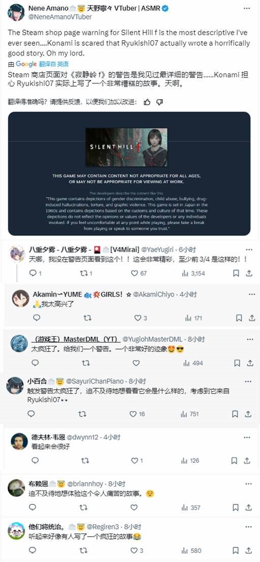 根据官方发布的免责声明,《寂静岭f》将包含性别歧视、虐待、霸凌、药物致幻、凌虐以及极端暴力等敏感内容。