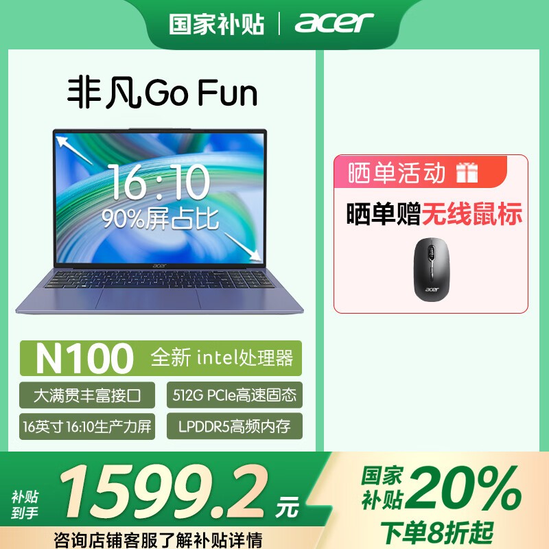 宏碁非凡Go Fun 16英寸轻薄本优惠价1599元