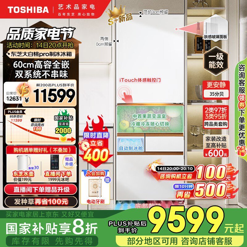东芝大白桃Pro冰箱满减+补贴到手8216元返600e卡