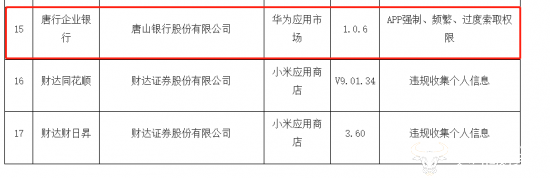 具体来看,12月11日,河北省通信管理局发布关于APP侵害用户权益问题的通报,其中唐山银行开发的“唐行企业银行”APP因为强制、频繁、过度索取权限等问题被通报。