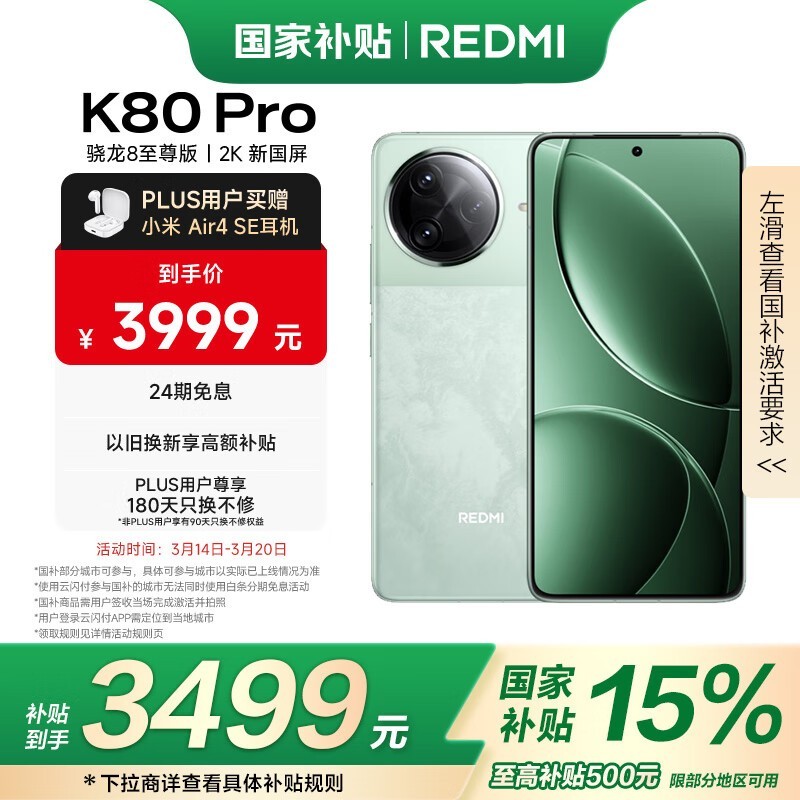 Redmi K80 Pro 5G手机山峦青12GB+512GB版特惠价3479元