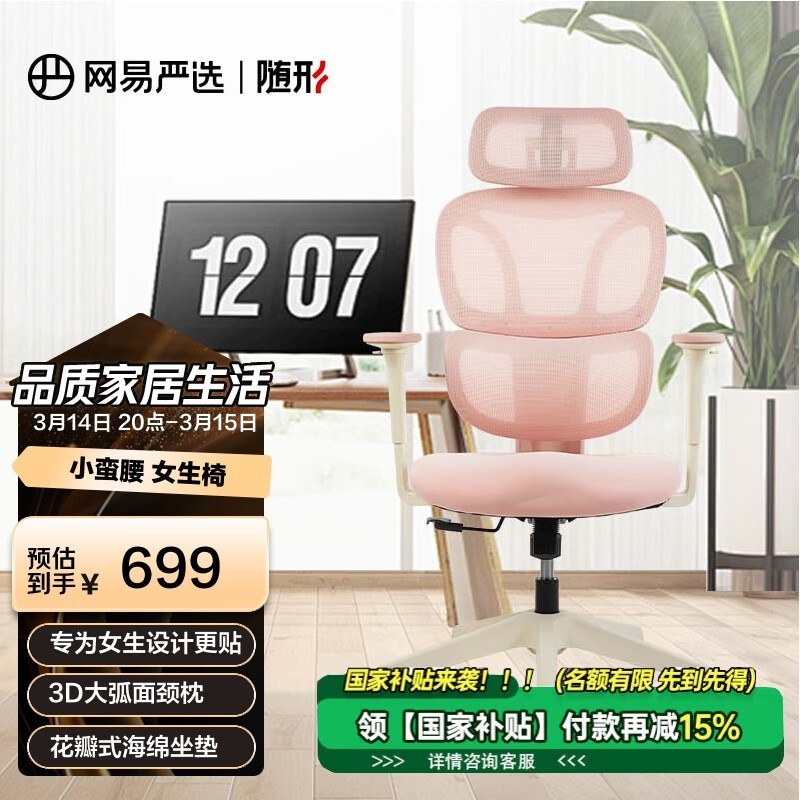 网易严选小蛮腰S9LADY女生椅女神椅春云粉配色可升降扶手