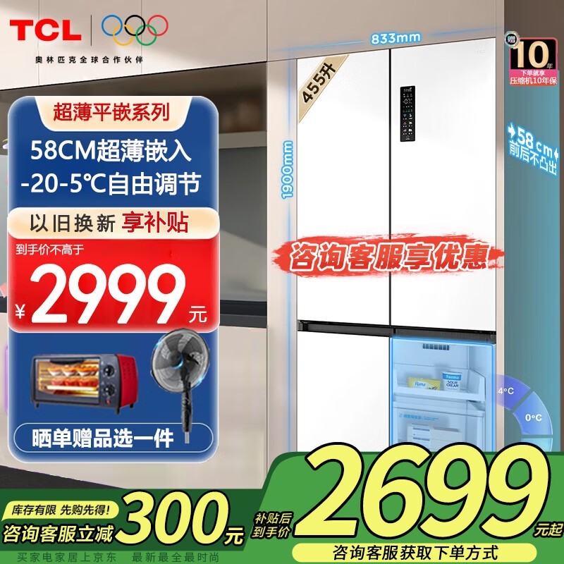 TCL超薄零嵌冰箱R455T9 - UQ仅需2999元