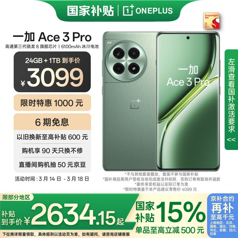 一加Ace3Pro全新绿野素青配色京东活动价2620元