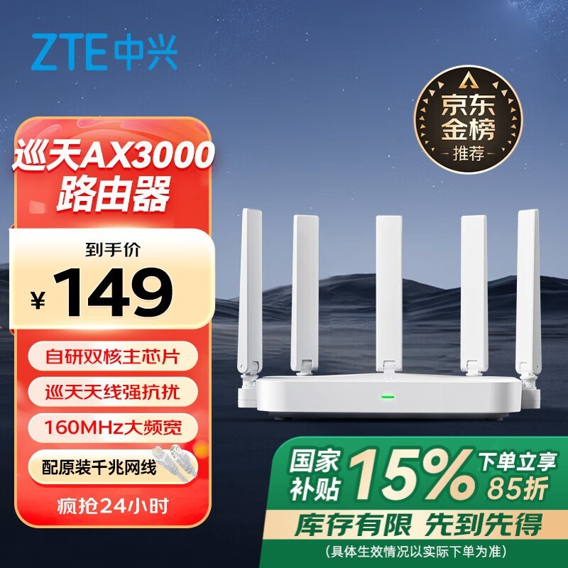中兴AX3000巡天版路由器促销,低至113元