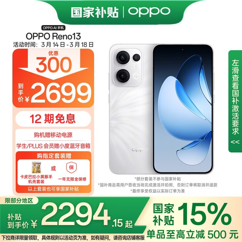 OPPO Reno13 5G手机心动白12GB+512GB大存储仅2281元