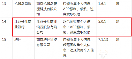 具体来看,在同一批被通报的APP中,江苏长江商业银行App也存在着超范围收集个人信息;App强制、频繁、过度索取权限等侵犯他人隐私权的行为。