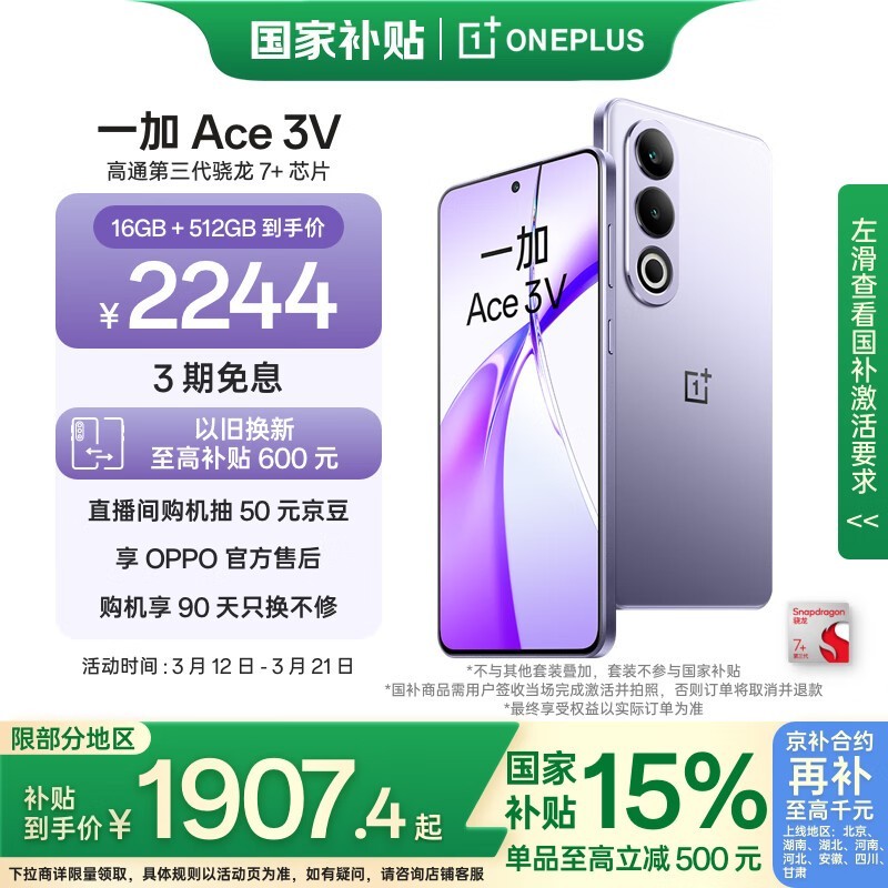 一加OnePlus Ace 3V手机(16GB+512GB)京东促销价1907元