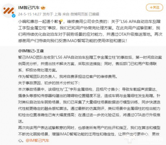 对于此次事件,智己汽车方面的回应比较迅速。2024年5月15日,智己汽车自动驾驶中心项目总监王康在社交平台发文称,智己IMAD团队第一时间启动案例高优分析,售后部门已和用户取得联系,积极协商处理方案。此外,王康还表示将自费承担客户的维修费用,智己汽车官方则回复称维修费用由公司负责。