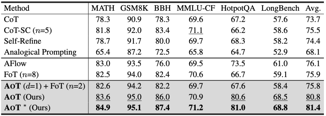 主实验结果,其中评估了三个变体:基础版本(AoT),作为插件与 FoT 集成的版本(AoT (d=1)+FoT (n=2)),以及一个计算密集型版本(AoT∗)