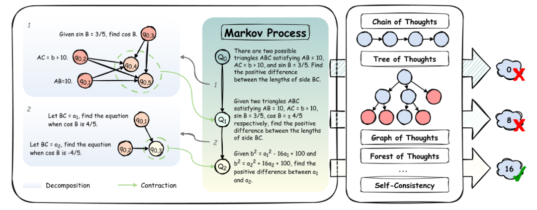拆解完成后,DAG 以规则化的方式区分子问题:无入边的节点被定义为独立子问题,有入边的节点被定义为依赖子问题。独立子问题的信息转化为已知条件,依赖子问题的描述则被整合为一个更简洁的独立问题,从而形成新的原子状态。这一状态的答案与前一状态的问题保持等价。由于马尔可夫过程从原问题初始化,所有状态均与原问题维持等价关系。