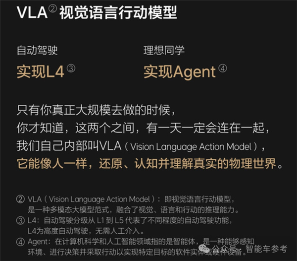 直白点说,理想的目标定位在具身智能,既包括智能汽车,也包括未来的更多可能,而当下要迈出的第一步,也是实现一切的基础,就是搭建好技术架构,实现视觉、语言、动作端到端融合训练,这就是VLA模型(Vision-Language-Action Model)。