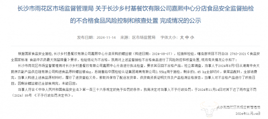 据悉,去年11月14日,长沙市雨花区市场监督管理局发布了《长沙市雨花区市场监督管理局 关于长沙乡村基餐饮有限公司嘉熙中心分店食品安全监督抽检的不合格食品风险控制和核查处置 完成情况的公示》公告。