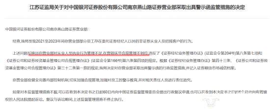 除此之外,在2024年4月16日,中国银河证券南京燕山路证券营业部被出具警示函,因营业部部分员工在2021至2023年间存在委托证券经纪人以外的非证券从业人员招揽客户的行为,反映出营业部对从业人员执业行为管理不足,在营销环节合规管理不到位的问题。