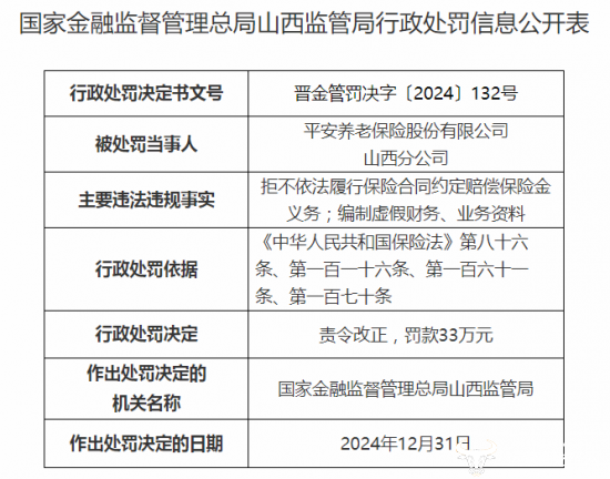 据山西监管局2025年1月3日发布的行政处罚信息公开表显示,平安养老山西分公司因“拒不依法履行保险合同约定赔偿保险金义务;编制虚假财务、业务资料”,被要求责令改正并罚款33万元,做出处罚的日期是2024年12月31日。
