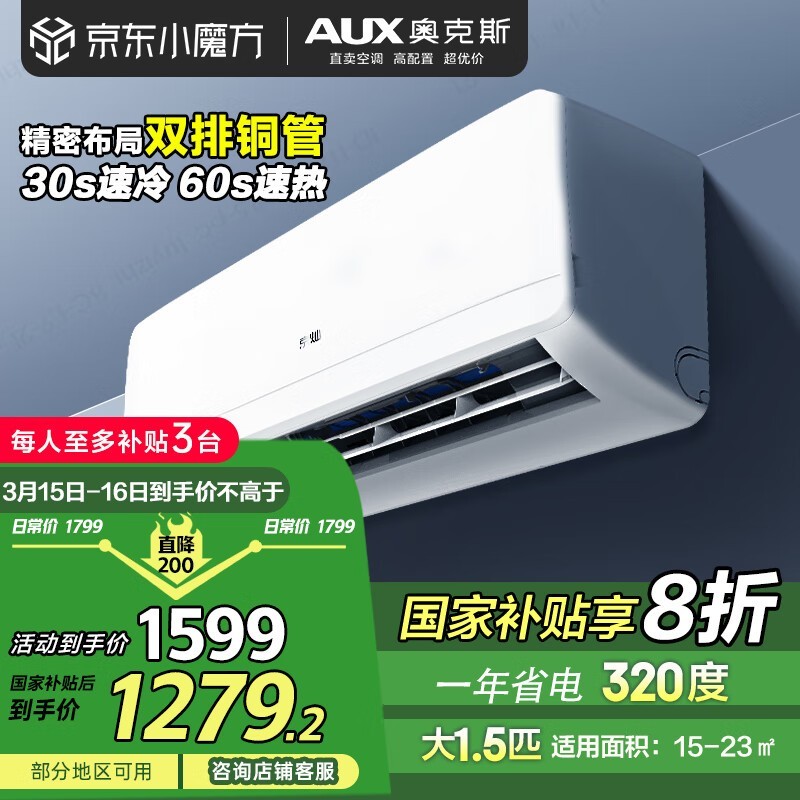 奥克斯(KFR-35GW)大1.5匹变频空调新1级能效省电静音仅1270元