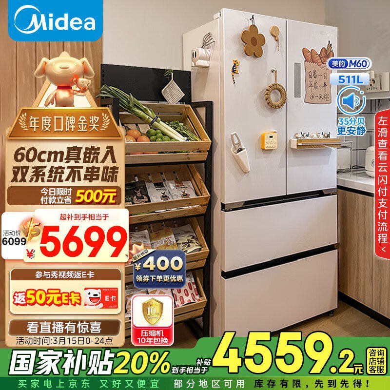 美的M60法式多门冰箱511L双系统风冷无霜促销