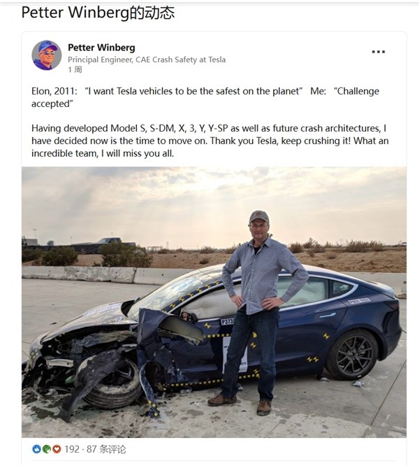 在开发了 Model S、S-DM、X、3、Y、Y-SP 以及未来的碰撞架构之后,我认为现在是时候离开了。谢谢特斯拉,继续勇往直前!多么了不起的团队,我会想念你们所有人。”