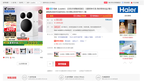 快科技3月16日消息,日前,海尔Leader三筒懒人洗衣机发布,目前已在京东开启预售,定价4999 元,首发国补后价格3999元起,新品将于4月17日首销。