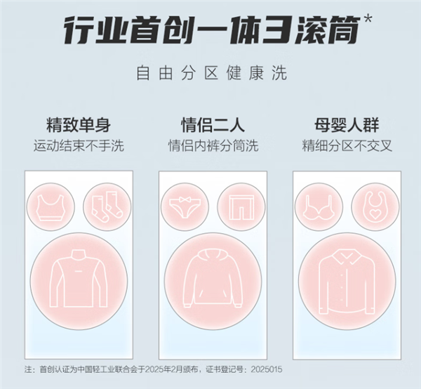 大筒可用来洗短袖、外套、长裤、床单等常规衣物,两个专洗筒分别洗内裤、袜子,全程0手洗。