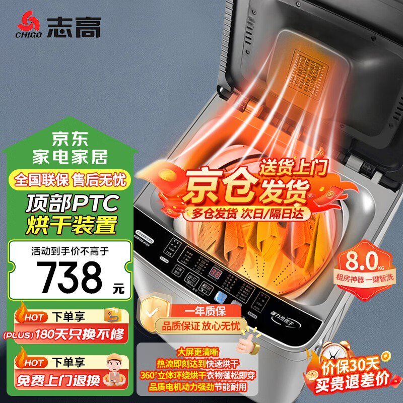 为小空间量身打造:志高XQB80-808智能波轮洗烘一体洗衣机,738元高效洗衣烘干专家