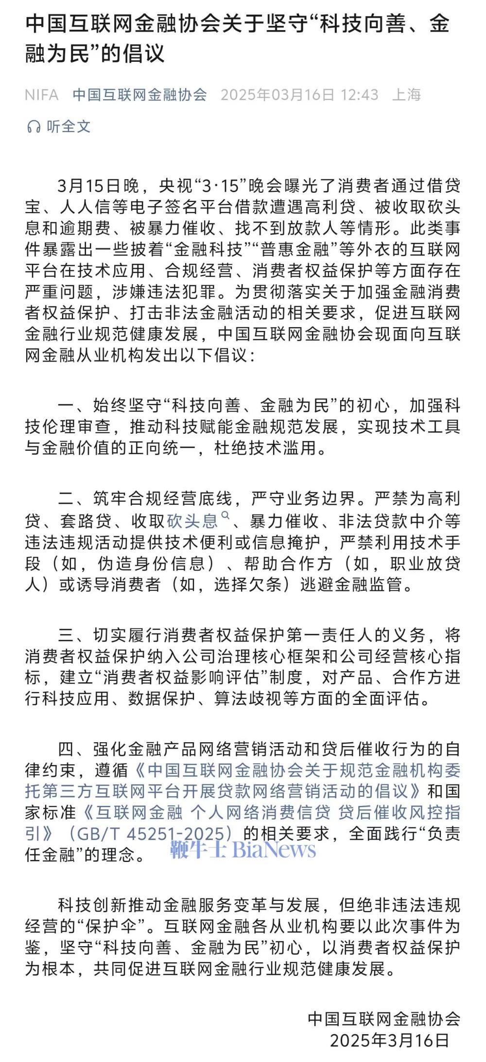 3月15日晚,央视“3·15”晚会曝光了消费者通过借贷宝、人人信等电子签名平台借款遭遇高利贷、被收取砍头息和逾期费、被暴力催收、找不到放款人等情形。此类事件暴露出一些披着“金融科技”“普惠金融”等外衣的互联网平台在技术应用、合规经营、消费者权益保护等方面存在严重问题,涉嫌违法犯罪。为贯彻落实关于加强金融消费者权益保护、打击非法金融活动的相关要求,促进互联网金融行业规范健康发展,中国互联网金融协会现面向互联网金融从业机构发出以下倡议: