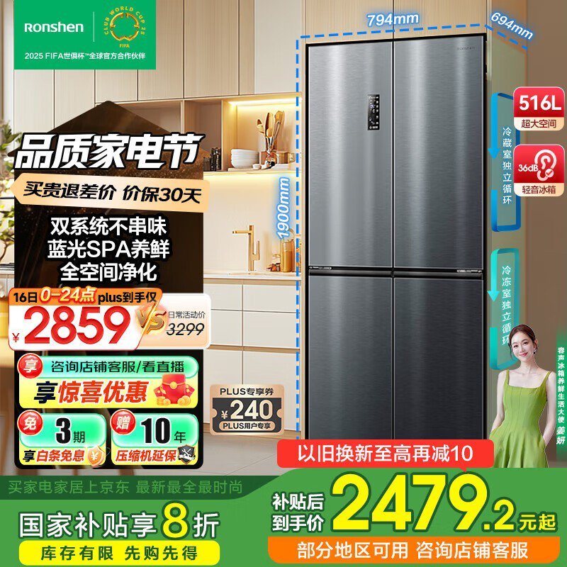 容声516L十字门冰箱,多种优惠到手2138元