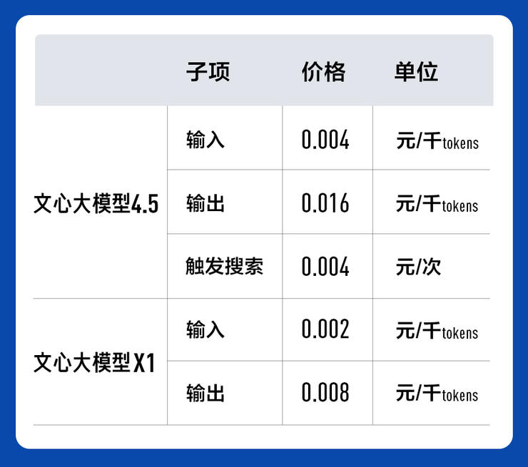 面对企业用户和开发者,文心 4.5 已在百度智能云千帆大模型平台上,输入价格为0.004元/千tokens,输出0.016元/千tokens,约为GPT4.5价格的1%;文心X1定价为输入0.002元/千tokens,输出0.008元/千tokens,也即将上线千帆。