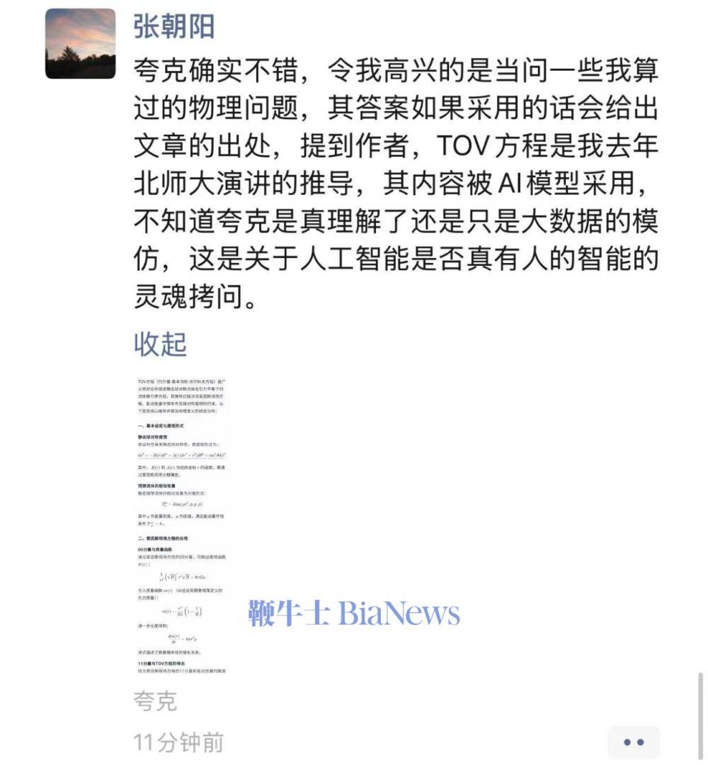 张朝阳表示,令其高兴的是,当问一些自己算过的物理问题,夸克的答案如果采用的话会给出文章的出处,提到作者,TOV方程是自己去年北师大演讲的推导,其内容被AI模型采用。