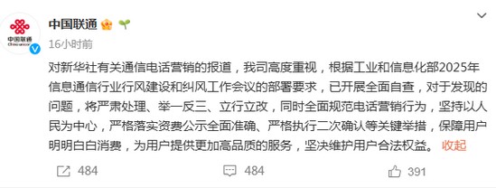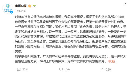 对新华社有关通信电话营销的报道,我司高度重视,根据工业和信息化部2025年信息通信行业行风建设和纠风工作会议的部署要求,已开展全面自查,对于发现的问题,将坚决迅速整治。并持续强化营销服务规范,加强对一线人员的培训及对代理商的管理监督,严肃惩处不规范行为,切实维护用户合法权益。
