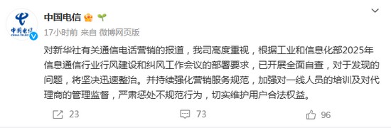 对新华社有关通信电话营销的报道,我司高度重视,根据工业和信息化部2025年信息通信行业行风建设和纠风工作会议的部署要求,已开展全面自查,对于发现的问题,将严肃处理、举一反三、立行立改,同时全面规范电话营销行为,坚持以人民为中心,严格落实资费公示全面准确、严格执行二次确认等关键举措,保障用户明明白白消费,为用户提供更加高品质的服务,坚决维护用户合法权益。