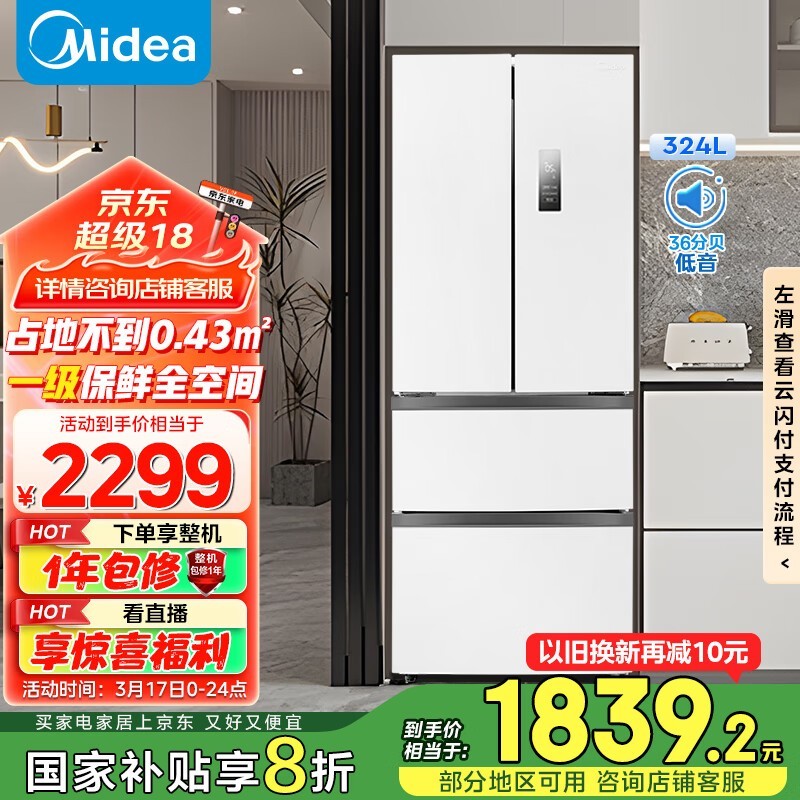 美的MR-340WFPE风冷多门冰箱324升极地白促销