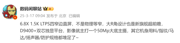 根据该博主的说法,REDMI K80至尊版将搭载一块6.8英寸左右的1.5K分辨率屏幕,屏幕采用四边窄边框直屏,但是不是物理意义上的等宽,但是新机的大R角设计将是小米新旗舰的超前瞻,估计与黑边能有不错的协调。性能上,该机将搭载不久后发布的天玑9400+旗舰级芯片,该机也将是首批搭载该芯片的机型之一。同时,REDMI K80至尊版还会配备独显芯片,以提升该机的游戏游玩体验。
