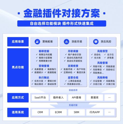 启信慧眼深知金融机构在数字化升级过程中所面临的诸多难题,如功能开发复杂度高、系统开发投入大、技术兼容问题以及人员适应周期等。为此,该方案提供了灵活、高效的解决方案,支持金融机构结合业务所需,自由选择营销拓客、贷前尽调、贷后风控等核心能力,并无缝集成至行内已有系统中。