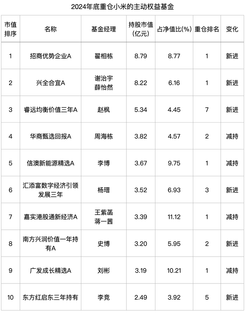 不同的投资阅历,都共识选择在2024年四季度将小米新买入前十大持仓。三人有何区别?哪一位更靠谱?