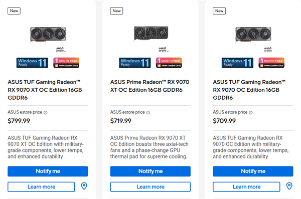 RX 9070系列显卡也未能幸免,例如华硕的Prime Radeon RX 9070 XT OC版显卡价格从上周的599美元上涨至719.99美元,而TUF OC版则高达799.99美元,这些价格远高于AMD官方建议的599美元零售价。