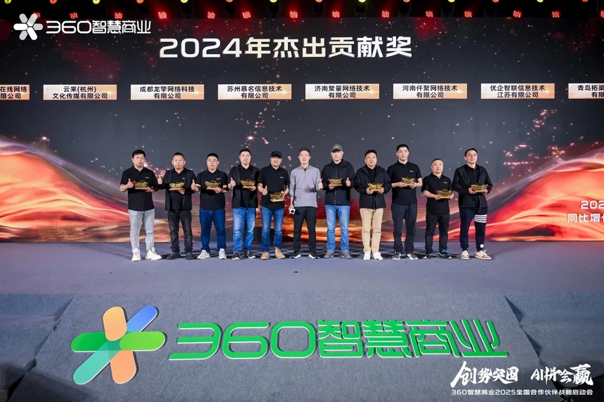 晚宴上,360智慧商业各业务负责人为年度优秀代理商颁发了“2024年杰出贡献奖”“2024年创新运营先锋”等荣誉,表彰他们过去一年在客户服务和业务开拓中的卓越表现。