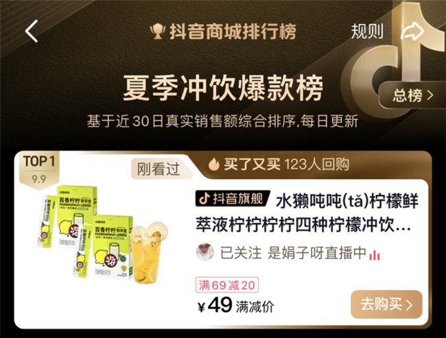 比柠檬片好喝,比雪王方便,水獭吨吨凭借其开创的“鲜萃液”品类,以300%的增速登顶抖音天猫类目第一,成为柠檬饮品市场的网红单品。